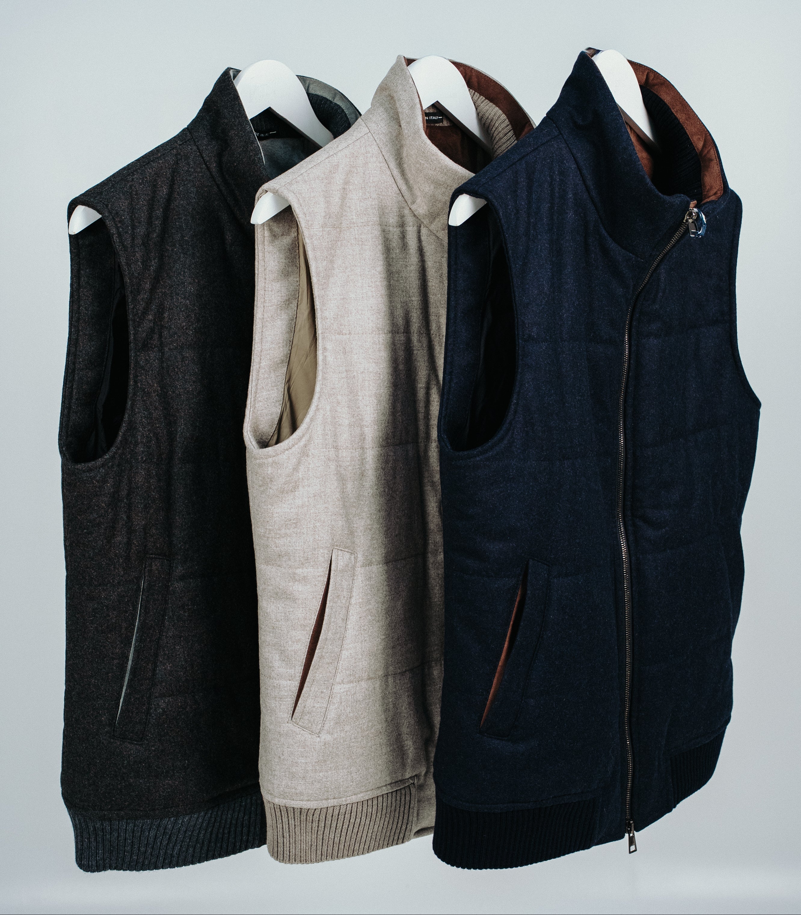 Crafted from Loro Piana’s Rain System collection, these gilets feature a premium wool–cashmere blend that offers exceptional warmth while providing reliable protection against wet weather.